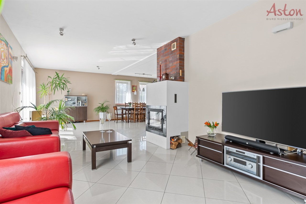 • Przestronny salon z kominkiem i wyjściem na taras oraz ogród