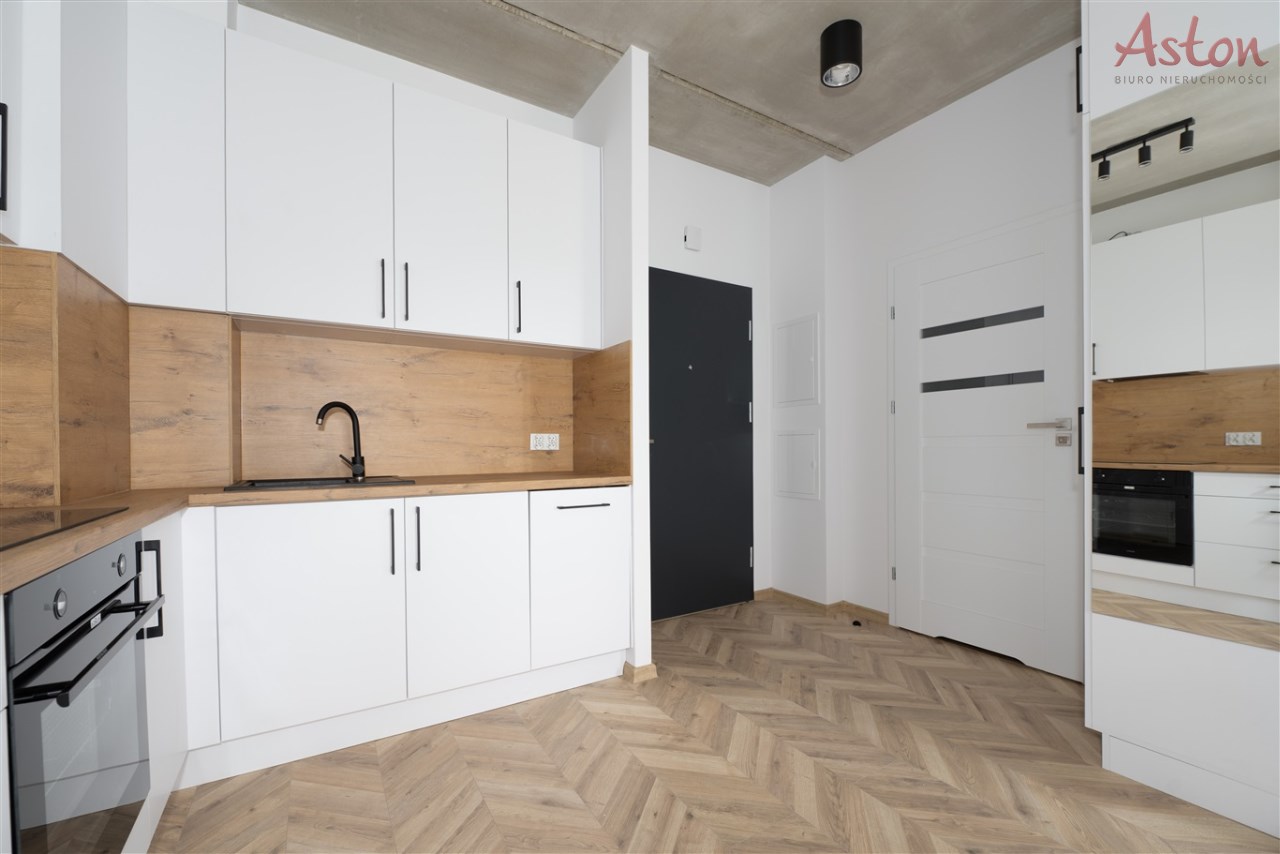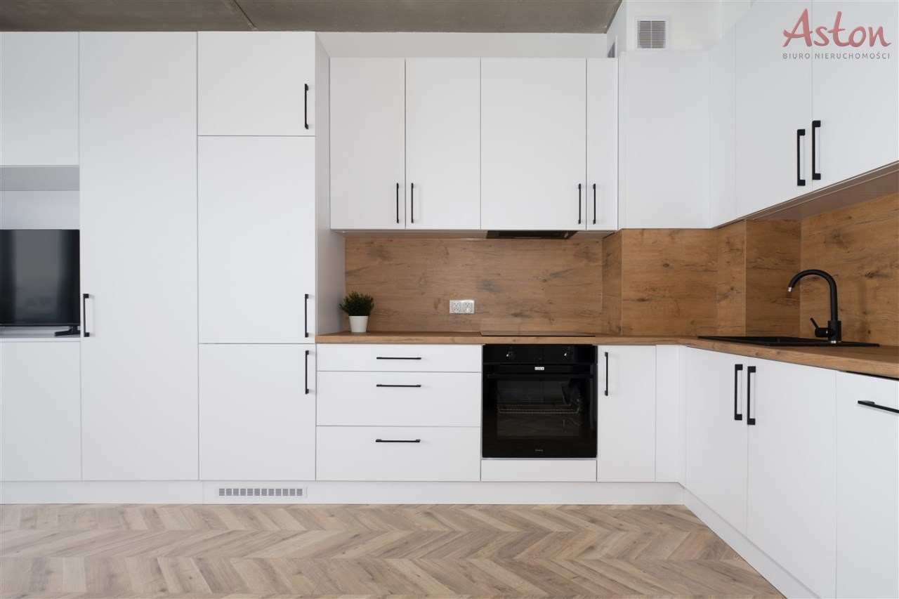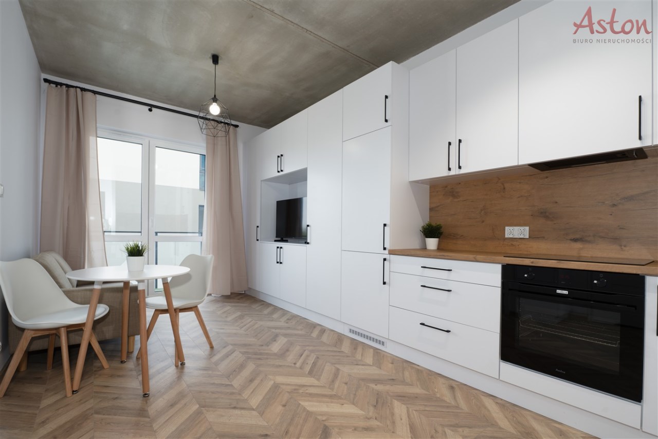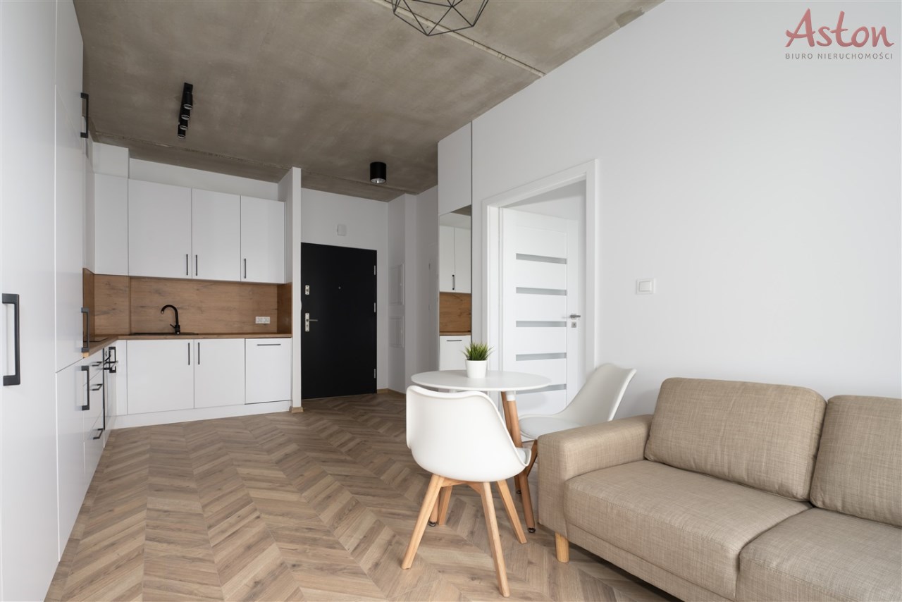 • Jasny salon z aneksem kuchennym i wyjściem na balkon