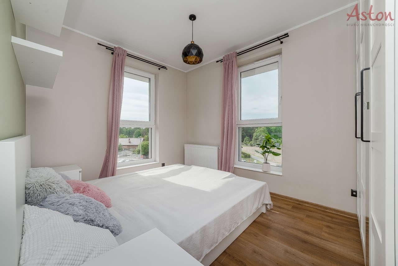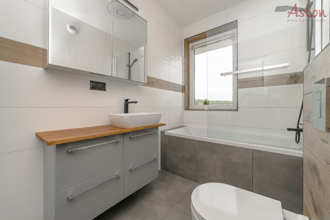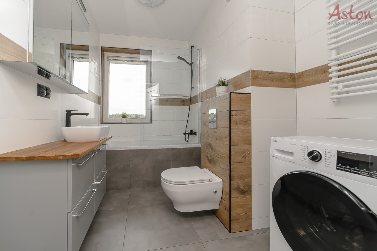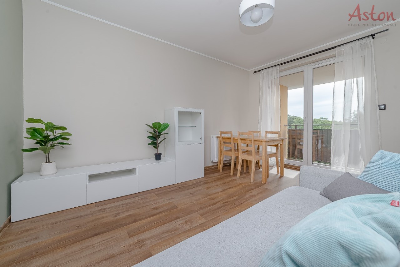 Mieszkanie jest w pełni umeblowane i wyposażone w niezbędne sprzęty. Do dyspozycji najemcy duży balkon typu loggia z widokiem na las oraz zabudowę jednorodzinną.