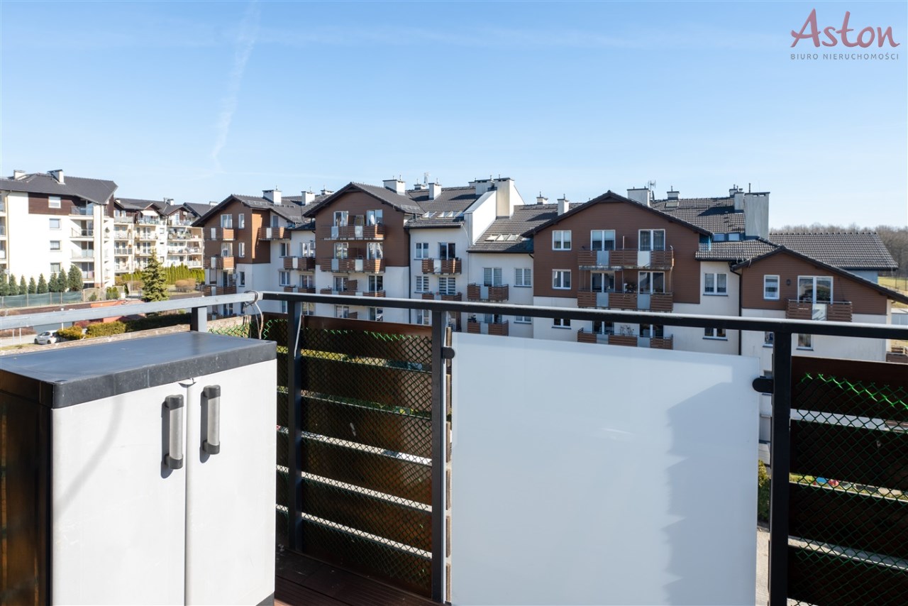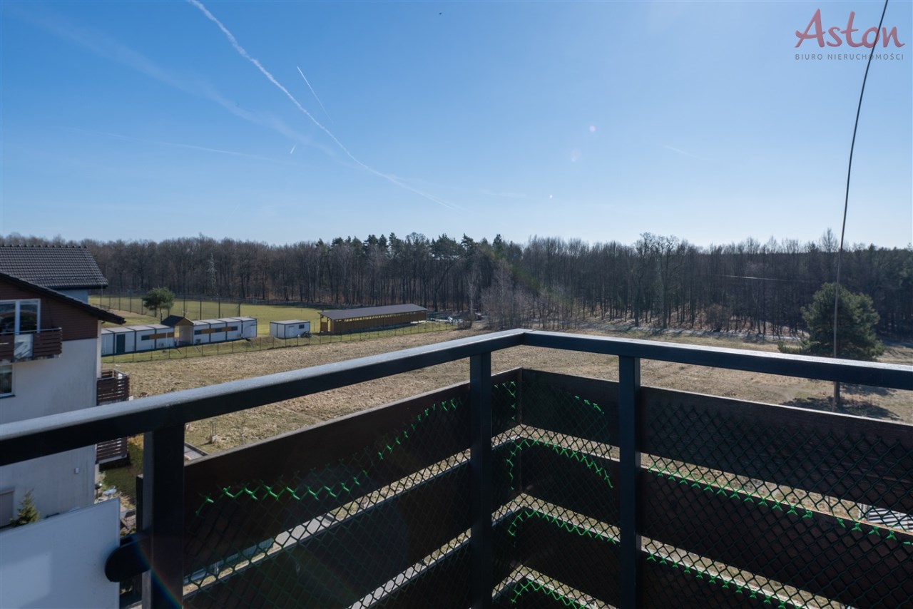 Dodatkowym atutem nieruchomości jest duży balkon z widokiem na las, który zapewnia spokój i możliwość relaksu po dniu pracy.